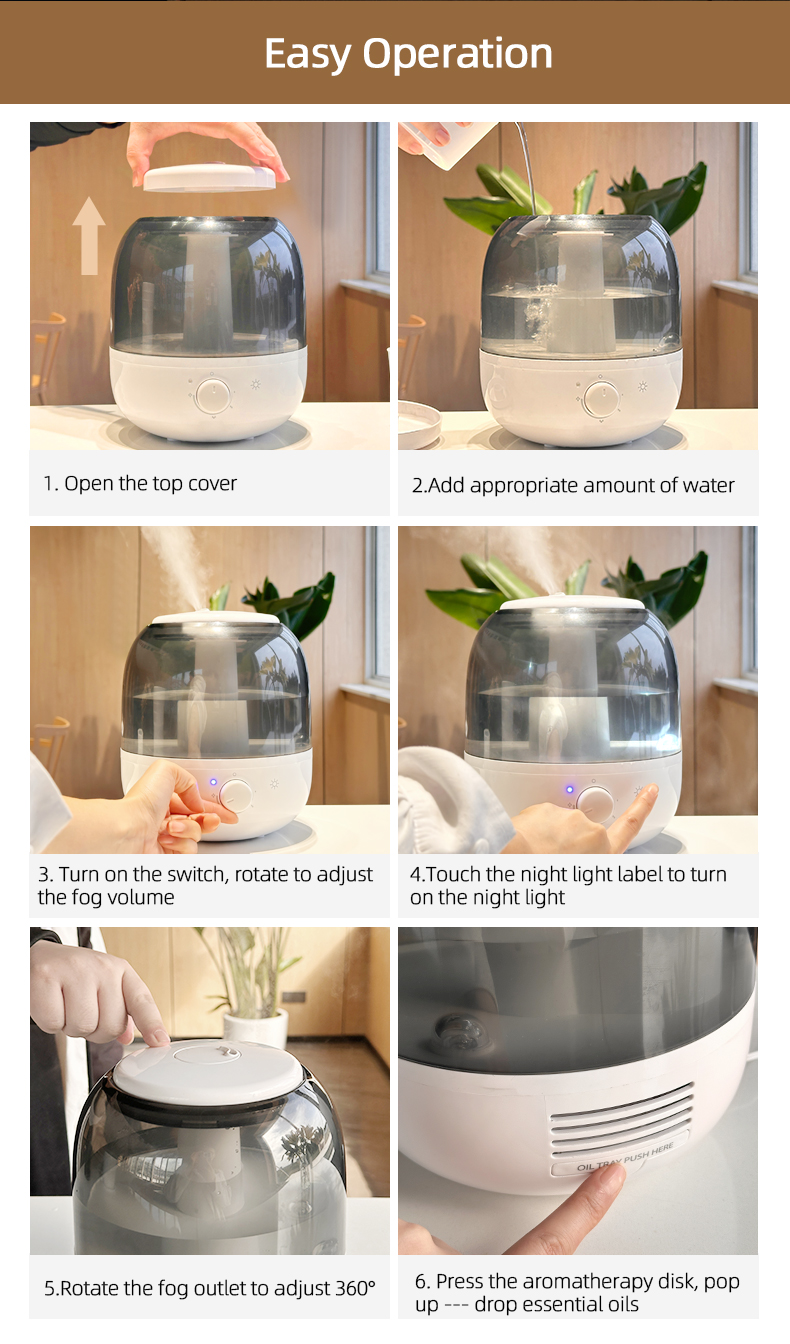 Nuestro nuevo humidificador ultrasónico de aromaterapia de gran capacidad de 5 litros para uso doméstico en hoteles hace que su uso sea más seguro e íntimo. Es más suave que los humidificadores convencionales y no perturba tu estudio, trabajo y descanso. Llenado superior del tanque de agua, conveniente y rápido, tanque de agua transparente, se puede ver el nivel del agua. Niebla nanofina de 300 ml/h, la niebla máxima puede funcionar durante 8 h, la niebla mínima puede funcionar durante 50 h, puede agregar aromaterapia para calmar su estado de ánimo. El cuerpo del humidificador está equipado con una luz nocturna independiente, para que tu noche esté llena de seguridad.
